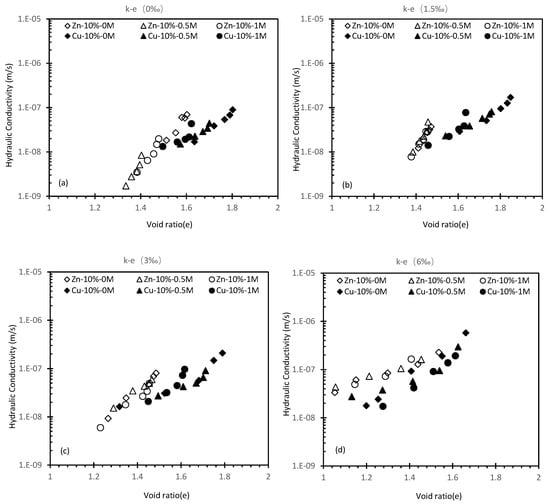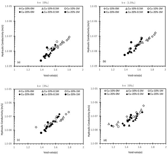 Results of 10% cement Cu (Figure 7) show that the impact of salinity was not noticeable between 0–1.5‰ metal fraction. A k changed to 2.58 × 10−8 m/s from 1.6 × 10−8 m/s can be found at 3‰ fraction when salinity was increased to 0.5M. Further increasing of salinity yields less improvement. However, in Figure 7 when the salinity was increased to 1M from 0.5M, the k increase is significantly higher than 0 to 0.5M. A possible explanation is the amount of cement in the 20% specimen was sufficient to overcome the suppression due to the ion-saline reaction