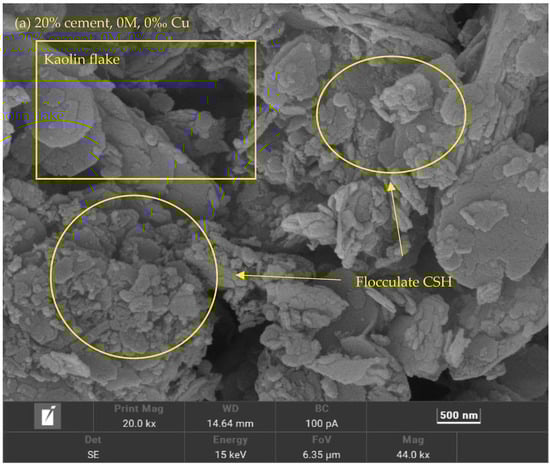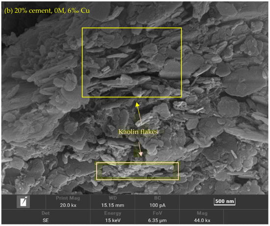 Figure 7 and Figure 8 show the correlation between k and e at different salinity levels. It can be observed that the cemented soils’ k increases when there are more metal fractions and there are no distinctive changes observed from the 0–1.5‰ stage. This can be observed via the SEM photo in Figure 9 that the flocculated Calcium Silicate Hydrate (CSH) has encased the kaolin particles (Figure 9a). The k of 10% cement specimen only increased to 8.69 × 10−9 m/s from 6.67 × 10−9 m/s and an increase from 4.47 × 10−9 m/s to 5.66 × 10−9 m/s at 20% specimen which is insignificant (Figure 7a). A notable change for the 10% cement specimen occurs when the metal fraction was raised from 3‰ to 6‰ (Figure 7c,d). Comparing to the increase to 1.15 × 10−8 m/s from 6.67 × 10−9 m/s observed at 0–1.5‰ the increase in this phase has spiked to 8.56 × 10−8 m/s from 1.6 × 10−8 m/s. The possible reason behind such a phenomenon is that during the process of cement solidification, the gel-formed CSH from cement’s hydration reaction will gradually fill the void between soil particles and will decrease the k of the solidified contaminated soil (Figure 10). However, the Cu ion in the specimen will affect the hydration reaction, causing the CSH percentage to rapidly decrease due to increased Cu fraction, resulting in higher e and k (Figure 11a).