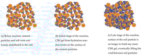 (a) Conceptual drawings of CSH filling the void of soil, including before the reaction, (b) early stage of the hydration reaction where CSH forms at the surface of cement particles, and (c) eventually filling the void between soil particles.