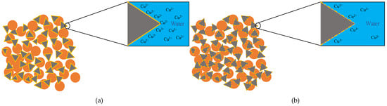 It should be worth noting that cement can compromise the k of soil. When the metal fraction is zero, a k reduction from 8.69 × 10−9 m/s to 5.66 × 10−9 m/s can be observed when the cement content was raised to 20%. The efficacy of reduction becomes greater as the metal fraction increases. It is likely that the Cu(OH)2 created from the reaction between OH− due to hydration reaction and Cu ion have encased the cement particles, suppressing further hydration reaction [,]. However, the additional cement particles can relatively compromise the suppression effect. When the hydration reaction continues, more CSH will fill the void, leading to a declined k (Figure 11b). The additional cement did not significantly reduce the k, only a reduction to 5.64 × 10−8 m/s from 8.56 × 10−8 m/s can be seen between 10% and 20% specimen at 6‰ which is negligible since similar changes can be seen at lower concentrations. Therefore, it can be concluded that the hydration reaction of 20% Cu cement content is fully suppressed as the k is similar to the 10% Cu specimen. Figure 8 shows a comparison between the Cu specimen and the Zn specimen under 10% cement content, the result from the Zn specimen shows that the k of Zn specimens is more susceptible to an increased metal fraction.