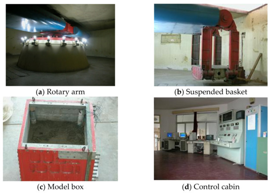 The test was carried out on a 50 g·t large geotechnical centrifuge of the Nanjing Institute of Water Resources. Figure 1 showed the main components of the centrifugal model testing machine used in the test. The beam centrifuge had a maximum radius of 2.25 m and was capable of generating a maximum acceleration of up to 250 g at a load capacity of 200 kg. The SCR (silicon-controlled rectifier) electrodeless speed control mode, which refers to the control mode for rotary loading of centrifuges, was adopted, and the advanced closed-circuit monitoring system and data acquisition system were assembled. The model was placed inside a box made of aluminum plates of 15 mm thickness with inner dimensions of 685 × 450 × 200 mm (width × depth × height), and the side was loaded and unloaded with organic glass, which was the monitoring window of the model in the experiment. Subgrade surface settlement was measured by a high-precision laser sensor. The sensor was manufactured by the German WENGLOR company, its measurement range was 0~50 mm, its reaction time was 5 ms, and its measurement resolution was better than 20 μm.