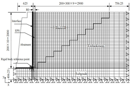 The gravity abutment was calculated by the plane strain model shown in Figure 4. The abutment was simplified as a rigid structure without deformation. The plane size of the model was: the height of the abutment and embankment was 20 m; the thickness of the foundation soil was 4.06 m; the range of backfill area was 2 m in the bottom and 29 m at the top along the route; the top length of the adjacent embankment was 7.56 m. The constraint conditions were: x, y direction constraint of the foundation bottom; the left and right sides of the foundation, x direction constraint; the right side of the embankment was x direction constraint; and the x direction constraint of the abutment. Consider the contact between the right side and the bottom of the abutment and backfill material and foundation. The foundation material of the gravity abutment was clay with 85% compactness; the adjacent embankment material was 90% compacted clay; and the backfill materials included: 85% compacted clay and aeolian sand. The treatment measures were: geogrid reinforcement and EPS interlayer.