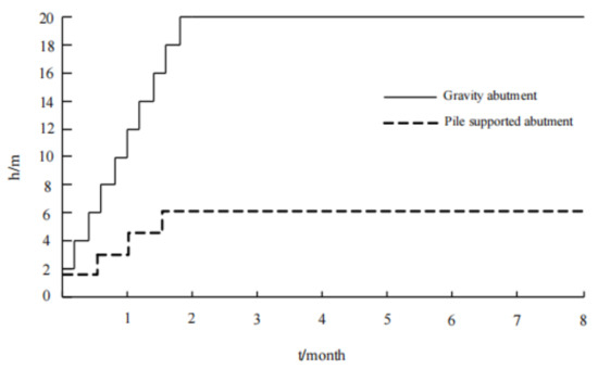 - Consolidation by applying pressure step by step. For the foundation samples in the pile-supported abutment model, the graded consolidation loads were 5 kPa, 10 kPa, 20 kPa, 30 kPa, 40 kPa, 80 kPa, 120 kPa, and finally the homogeneous foundation soil with an undrained strength of 17 kPa was formed.