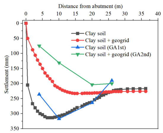 The compactness of the two groups of models, GA1st and GA2nd, of the gravity abutment structure clay backfill was very close. The former backfill had nine layers of geogrid, and the latter was plain soil backfill. The surface settlement distribution of backfill is shown in Figure 7.
