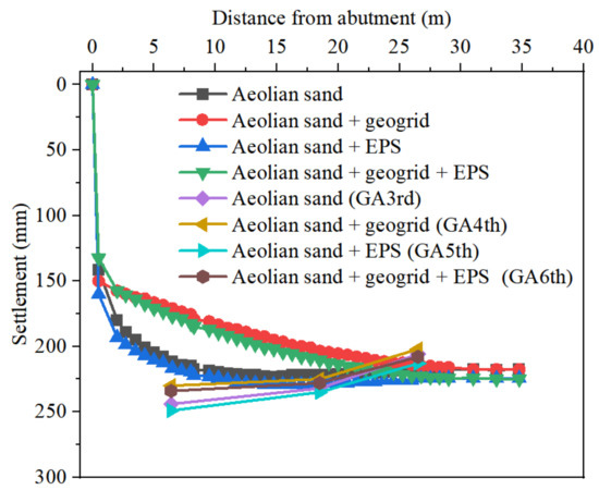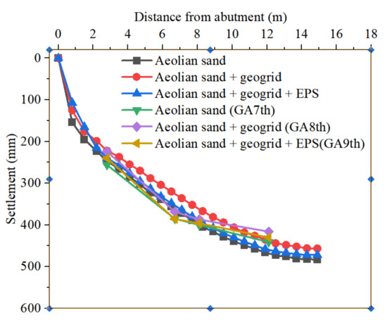 The backfill materials of the models GA7th, GA8th and GA9th of pile-supported abutment were aeolian sand. The density of the backfill was basically the same, but the treatment measures were different. The model GA7th had no treatment measures, and the model GA8th adopted geogrid reinforcement; while the model GA9th contained an EPS interlayer and adopted grid reinforcement. The application of geosynthetics in concrete backfill was shown in Table 1. Figure 12 shows the distribution curve of backfill surface settlement corresponding to different treatment measures. Table 5 shows the numerical numerical results and test results of the mean surface settlement of backfill corresponding to different treatment measures. As a comparison, the ratio of the surface settlement after treatment to that before treatment was also calculated.