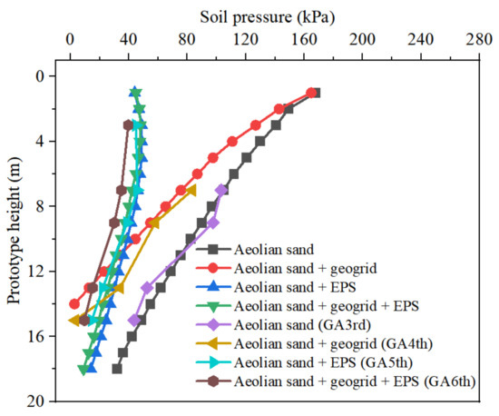 Figure 9 and Table 4 showed that the earth pressure resultant force of reinforced aeolian sand was only 64.26% of that of aeolian sand, which was reduced by 35.74%. The main reason was that the application of reinforced materials improved the strength of backfill materials, thereby reducing the lateral earth pressure on the back of the abutment. After the EPS interlayer was set between the abutment and the backfill, the lateral displacement of the backfill material was allowed, and the earth pressure behind the abutment was in an active state. At this time, the earth pressure was only 40.62% of the aeolian sand, which was reduced by 59.38%. In addition, when the grid reinforcement was combined with the easily deformed EPS interlayer, the resultant force of earth pressure acting on the back of the abutment was only 35.47% of that of aeolian sand, which was reduced by 64.53%.