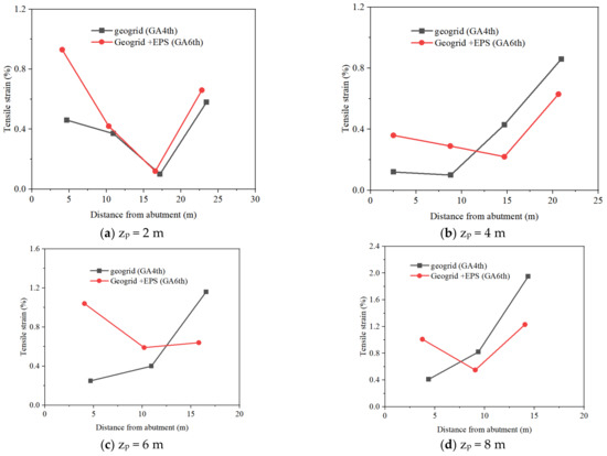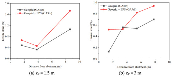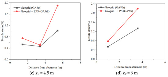 From the strain values of GA8th and GA9th geogrids in Figure 14 and Figure 15, it can be seen that when there was no EPS interlayer, the strain of geogrid near the interface between backfill and adjacent embankment sections was the largest, which reached 2.2%, and the tensile force was also the largest. In addition, the deeper the geogrid was buried, the larger the tensile strain was. After adding an EPS interlayer between the abutment back and the backfill, the strain of geogrid increased generally. At the same time, in terms of spatial distribution, the strain in the geogrid presented the distribution characteristics of being large at both ends and low in the middle overall (especially zp = 1.5, zp = 3.0). For the case without an EPS plate, the geogrid-reinforced layer only had large tensile strain on one side of the backfill and adjacent subgrade. This strain spatial distribution feature was the same as that of gravity abutment with an EPS interlayer.