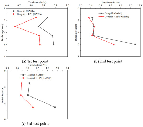 Tensile strain of geogrid with different distance from abutment for different burial depths.