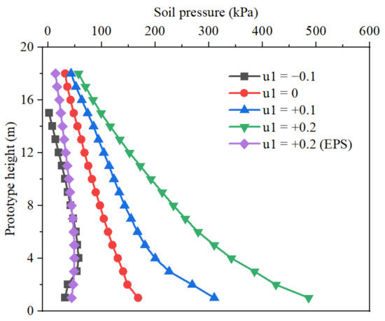 It can be seen from Figure 16 that the displacement of the abutment back had a significant impact on the earth pressure. When the active displacement of the abutment back away from the filling direction occurred, the earth pressure was significantly reduced, which decreased from 490 kPa to 55 kPa when u1 decreased from +0.2 m to −0.1 m. On the contrary, when the passive displacement of the platform back towards the filling direction occurred, the earth pressure increased significantly. If no measures were taken, the stability and safety of the structure would be threatened. However, after setting an EPS interlayer with a modulus of 1500 kPa, the earth pressure on the back of the platform decreased significantly. In the middle and lower part of the abutment back, the earth pressure on the platform back under +0.2 m passive displacement was even smaller than the active earth pressure with displacement of −0.1 m. Therefore, an EPS interlayer with low modulus and easy deformation could eliminate the influence of the back displacement on earth pressure and ensure the stability and safety of the structure.