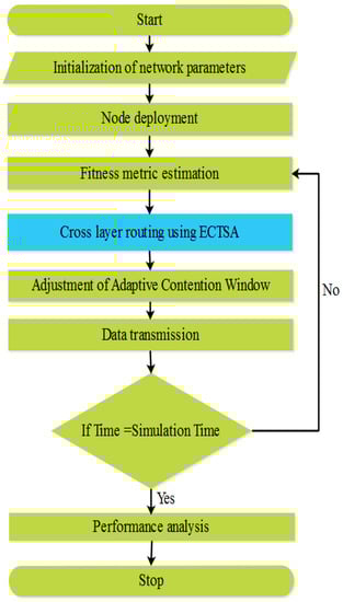 Wireless links pose network difficulties, which are overcome using a cross-layer design. For example, consider a traditional transmitter that misinterprets a wireless fault as a network congestion notification. Using additional cross-layer design techniques, one of the most important properties of the wireless medium is utilized. In this work, an energy-efficient cross-layer routing is accomplished by developing the ECTSA for the MANET. This ECTSA selects the optimal path by considering four distinct objective functions: residual energy, communication cost, DSR, and mobility. Among these, the energy, DSR, and mobility are calculated from the network layer. Additionally, the network contention is calculated from the MAC layer and the CW is adjusted according to the residual energy and contention to minimize the energy consumption of the nodes. The flow chart for the ECTSA-based cross-layer routing is shown in Figure 3.