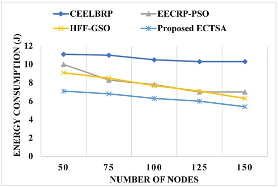 Figure 4 shows the comparison of energy consumption for CEELBRP [24], EECRP-PSO [25], HFF-GSO [28], and the proposed ECTSA. The energy consumption of the ECTSA is varied from 5.4 J to 7.1 J, which is less when compared to the CEELBRP [24], EECRP-PSO [25], and HFF-GSO [28]. The developed ECTSA achieves lower energy consumption due to its cross-layer routing, shortest path generation according to the fitness metrics, and CW adjustment. However, the CEELBRP [24] and EECRP-PSO [25] do not considered distance; therefore, the energy consumption is increased because the transmission path has a higher distance.