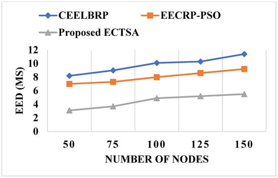 Table 5 shows the performance analysis of EED. Figure 6 shows the comparison of EED for the CEELBRP [24], EECRP-PSO [25], and ECTSA. The EED of the ECTSA is varied from 3.1 ms to 5.5 ms, which is less than the CEELBRP [24] and EECRP-PSO [25]. The developed ECTSA achieves less EED because of its transmission path with less distance and fewer control packet requirements during path generation.