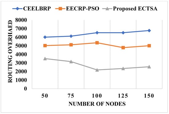 Figure 7 shows the comparison of routing overhead for the CEELBRP [24], EECRP-PSO [25], and ECTSA. The routing overhead of the ECTSA is varied from 2561 packets to 3510 packets. From the analysis, it is concluded that the ECTSA achieves less routing overhead than the CEELBRP [24] and EECRP-PSO [25]. The ECTSA-based cross-layer routing does not require a high amount of control packets, because it uses effective fitness metrics to identify the transmission path.