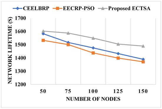 The evaluation of network lifetime is shown in Figure 8. In comparison to earlier CEELBRP [24] and EECRP-PSO [25], the lifetime of the proposed ECTSA has increased. Additional sensor nodes start guiding packets randomly as the network’s node count increases, and there is a good possibility that the node dies at some point. In the proposed ECTSA technique, only the best node is selected to transport packets, providing longer battery life and network lifetime. Table 8 shows the results for the comparison of network lifespan performance.