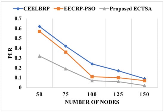 The suggested ECTSA and element model of the existing method was utilized to test the efficiency of the PLR. When compared to conventional techniques, the ECTSA yields better results. In comparison to the existing CEELBRP [24] and EECRP-PSO [25], the ECTSA has a lower PLR. The results demonstrates that the suggested ECTSA has a better PLR of 0.02% than conventional approaches, which have PLRs of 0.07% and 0.08%, correspondingly. Figure 9 shows the performance analysis of PLR. The performance of the proposed ECTSA, CEELBRP [24], and EECRP-PSO [25] is depicted in Figure 10.