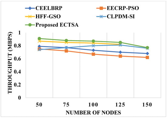 Figure 10 depicts the results of the throughput performance of conventional and proposed procedures. The proposed ECTSA provided better throughput results than the CEELBRP [24], EECRP-PSO [25], CLPDM-SI [26], and HFFGSO [28]. The access point obtains additional network packets, since the ECTSA has a lengthy network lifetime. Table 9 shows that the suggested ECTSA obtained a high throughput of 0.91 Mbps, compared to the existing CEELBRP [24], EECRP-PSO [25], CLPDM-SI [26], and HFFGSO [28].