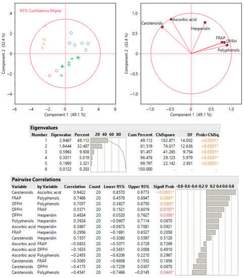 Orange peel extraction plots utilizing the principal component analysis (PCA), using various extraction techniques and hydroethanolic solutions. PCA 1 and PCA 2′s axis scores were shown. Each of the six distinct bays, each of which has a different line allocated to it, corresponds to one of the six variables used in the PCA. Physicochemical properties include the concentration of hesperidin, total polyphenols, antioxidants (FRAP and DPPH), ascorbic acid, and total carotenoids. Pairwise correlation analysis was used to estimate the physicochemical properties. Asterisks and colored values indicate the statistically significant values.