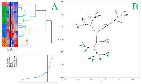Hierarchical cluster analysis for the optimal extraction of the orange peels, using various extraction techniques and hydroethanolic solutions. Plot (A), hierarchical clustering as a dendrogram, and plot (B), constellation plot.