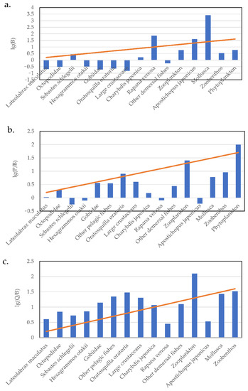 Figure 2. PREBAL of the Laizhou Bay model plotting: (a) Biomass estimates (t/km2); (b) the production/biomass ratio; and (c) the consumption/biomass on a log scale vs. species ranked by trophic level, from highest to lowest trophic level.