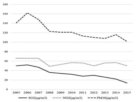 Annual average concentration of air pollutants in Beijing, 2005–2015.