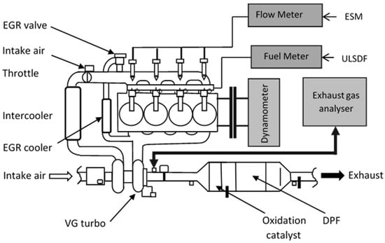 The pre-mixed fuel, which was applied in our research work, contained ethanol, whereby the applied analyser was calibrated by the propane, i.e., without oxygen. Therefore, some uncertainties may occur in the values obtained from the THC measurement. Uncertainty regarding the THC measurement depends on the concentration of oxygen-free hydrocarbons and unburned ethanol in the exhaust gases. Taking into consideration the fact that a detailed measurement of the characteristics of HC was not performed in our tests, it is difficult to determine the level of uncertainty in the individual measurements. However, the producer of the above-mentioned analyser promises that the additional error will be less than 1.0%. This error can also be considered as systematic and consistent for all the ESM cases. The engine fuels applied during our tests were commercial fuels: an ESM (85% ethanol) of bioethanol/gasoline and the diesel fuel EN590 (ULDSF) [16,17,18,19,20]. The physical and chemical properties of these tested fuels are presented in Table 2.