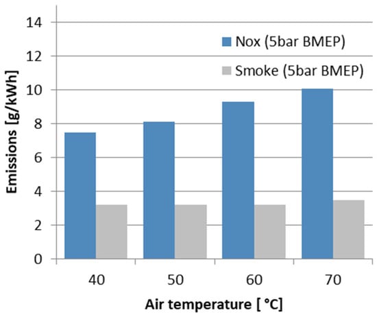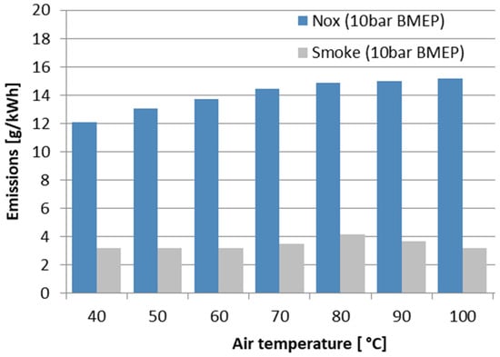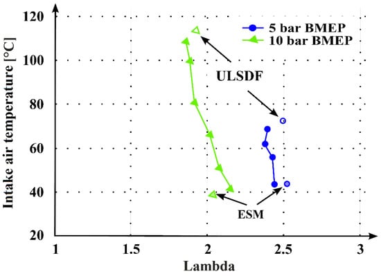 The lambda values (λ), which are defined by the intake air mass flow and fuel mass flow, are summarised in Figure 2. These values remained relatively unchanged in both cases of the engine load. A small change occurred for the highest temperature of intake air when applying ESM. Even in the cases of the lowest temperature values, i.e., when the amount of ESM increased, the value of λ moderately changed. If the intake air temperature decreased, the λ values had a moderately increasing trend; however, the individual differences were less than 0.2 [28,29,30,31,32,33,34].