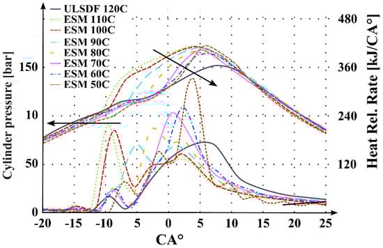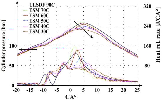 The cylinder pressures and HRR values at the engine speed of 1280 rpm and at 5 bar BMEP (break mean effective pressure) are visible in Figure 3. The compression pressure values are moderate when using the ESM, which is probably due to the evaporation of fuel during compression stroke. The relevant differences were observed among the maximal cylinder pressure values in the case of different intake air temperatures. In the case of the highest temperature levels, the maximal value of pressure in the cylinder approached the diesel reference value. When the temperature decreased to 50 °C or less, the maximal pressure value also decreased significantly.