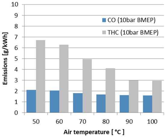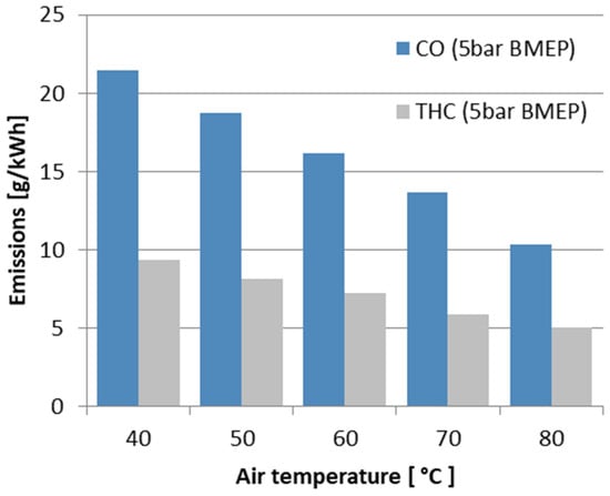 With regard to the fact that the THC emissions were considered as an amount indicator of the unburned fuel, the CO emissions indicated the rate of an incomplete fuel combustion process. The main trends were quite similar to those for the THC emissions (Figure 5 and Figure 6), but we also discovered several evident differences. The fuel charge had a stronger and more linear influence on the CO emission values. At the 10 bar BMEP pressure level, the addition of ESM slightly reduced the CO emissions. The emissions of THC and CO increased in all the ESM cases, whereby lowering the intake air temperature tended to increase the amount of emissions, mainly at low loads. In the case of ESM, the THC and CO emission values were high; therefore, it would probably be necessary to apply an additional post-processing of the exhaust gases in order to fulfil the emission legislation.