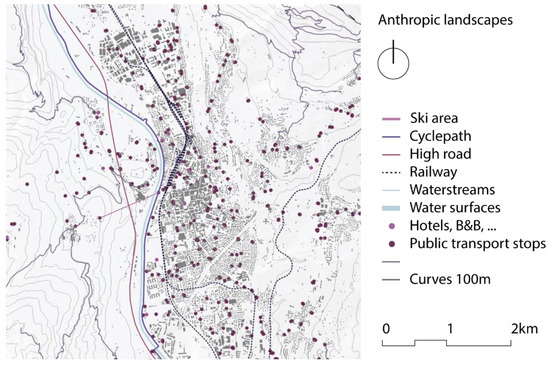 A map of the mobility system can be useful to understand the flux of the human activities in the analyzed region. The mobility system can be divided into public and private transport. The heatmap of the bus stops represents the accessibility of the public transport system. Private transport is divided into slow and fast mobility to highlight the different ways of moving into and outside of the territory. It was decided to include the touristic system into the mobility system map to show the flows of the people and resources and their distribution over the territory as this is one of the main economic sectors of the region. If it is connected with the transport map, it is possible to visualize the possibilities of the movement of tourists in the area and thus, deduce their way of moving around and accessing the sites of interest. In the mountain areas, it is particularly interesting to map the ski lifts and ski areas. In Figure 3, we report the layers of the anthropic landscapes map.