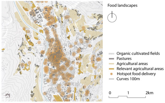 The third category, in terms of its impact, is related to food consumption and waste, which accounts for 9.3% of the total emissions, or 0.23 tCO2eq. The data on the average amount of food consumption comes from research that was carried out by the Italian CREA Institute on the regions of north-eastern Italy, and they are weighted according to the percentage of the female and male population. The high consumption of animal products, such as meat and dairy products, is the cause of the emissions. The food system map shows the heatmap of food sales and distribution points and the food-productive areas. In this way, it is possible to visualize the food accessibility of the studied region and relate it to other systems, such as the mobility and settlement systems. The addition of specific layers, such as the presence of the organically cultivated areas and a variety of products, makes it possible to observe the levels of support for the biodiversity that is provided by the local agricultural areas. Some areas could hide some critical features from a sustainable point of view: the so-called ”dark side of the green side”. For instance, the crops that are treated with chemicals, pesticides, and fertilizers could have a negative impact on the environment. Therefore, a hierarchy of the green areas based on the sustainability of the different cultivation or management methods could be discussed and proposed. In Figure 4, we report the layers of the food landscapes map.