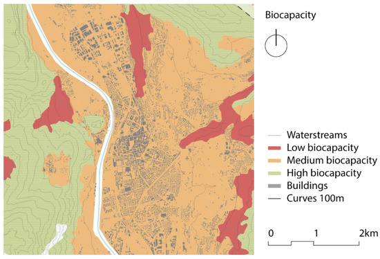 The carbon footprint of Trentino’s inhabitants turns out to be 2.55 tCO2eq, which when rendered in terms of global hectares (gha) for it to be compared with the biocapacity, which equals 2.72 gha. The map in Figure 5 shows the average biocapacity of the Trento case studies according to the different land use classification.