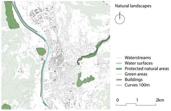 To deepen of the biocapacity analysis, the green and blue systems were elaborated. This map represents the forests, pastures, crops, and urban green areas as parks and gardens. The green systems’ map could be the basis for the analysis of the ecological corridors. A further step that we took was the evaluation of the diverse green systems. The following layers, which were downloaded from the open data catalogues, were added to the map of the Green and Blue system (Figure 6).
