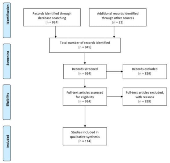 Initial search results across these three databases revealed a total of 924 studies. Within this total, we found 184 results on ProQuest, 188 on Scopus, and 552 on Web of Science. We included a total of 114 full-text articles and reports in the final study. In all, 93 studies resulted from the search string and 21 emerged via exploratory research in the initial research stages.