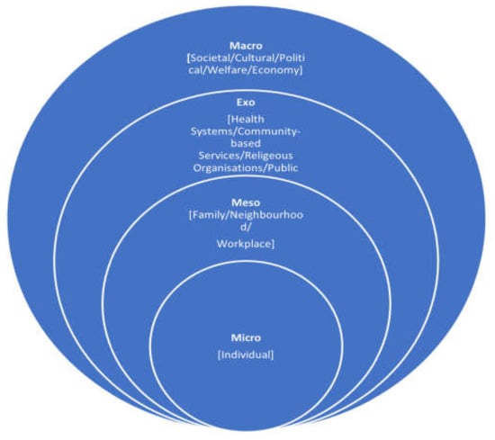 The first primary concept identified is Bronfenbrenner’s biological theory of development and resilience. This theory offers a systems theory analysis framework to permit study and measurement of emotional resilience at individual and community levels. It examines interconnectedness among these systems through micro, meso, exo, and macro perspectives [25]. Figure 2 shows these relationships. The micro level relates to the individual, while the meso level expands to locate the individual within their family, neighborhood, and workplace networks [25] The exo level considers the micro and macro levels within broader systems, including health systems, community-based services, religious organizations, and public media [25]. The macro level, the broadest, includes interactions among all other levels (with broad society, culture, politics, welfare, and economic sectors) [25].