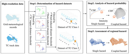 In this paper, a novel TC hazard assessment framework is proposed and divided into three steps: determination of hazard datasets, analysis of hazard probability, and assessment of regional hazards. The analytical framework of this work is shown in Figure 1.