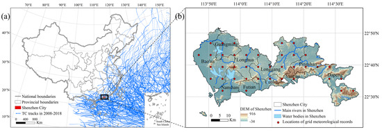 Shenzhen, which is an economically developed and densely populated coastal megacity in China, has an area of 1997.47 , a GDP of 2.69 trillion yuan and a permanent population of 13.44 million as of 2019 http://www.sz.gov.cn/en_szgov/aboutsz/profile/content/post_10093130.html (accessed on 23 October 2022), a total road mileage of 8066.1 km, and a civilian car ownership of 3.53 million as of 2020 http://tjnj.gdstats.gov.cn:8080/tjnj/2021/directory/15/html/15-11-0.htm (accessed on 23 October 2022). Shenzhen faces the South China Sea and the Pearl River. It has a subtropical oceanic climate. During summer, Shenzhen is vulnerable to frequent TCs from the western Pacific Ocean. With the development of infrastructure, the TC risk to Shenzhen’s transportation system, communication system, and buildings has increased.