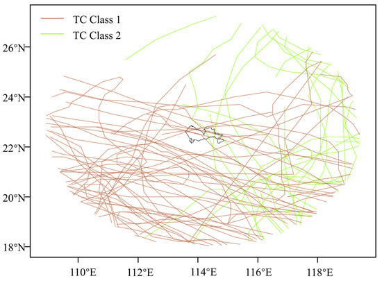 First, for each grid point in Shenzhen, we calculated the distance from the TC center in all the track records (Figure 2a) to the grid. The grid point was classified as being impacted by TCs at that moment if ≤ 500 km. From 2008–2018, 74 TCs affected Shenzhen, with an average duration of 47.89 h. Then, we clustered the TC tracks affecting Shenzhen based on the fine-tuned K-means algorithm. We clustered the TC tracks into two classes, and the maximum number of iterations was 100. Figure 3 shows that the two TC classes can be roughly interpreted as landing from the west side of Shenzhen (Class 1) or the east side (Class 2). Furthermore, we retrieved the hourly wind speed and precipitation data for a grid point if the 24 h cumulative precipitation was greater than 50 mm or the wind speed was greater than 10.8 m/s. Thus, we created TC-induced wind speed and precipitation datasets for 39 grid points and 2 TC classes. Approximately 80–200 samples were recorded per grid point for each TC class. Next, we analyzed the TC hazards from the single variable (wind or precipitation) and coupled variables (joint wind–precipitation).
