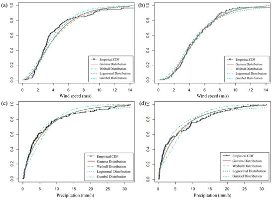 We randomly picked one grid point (denoted by ) as an example to analyze a single hazard. There were 105 records of grid point for TC Class 1 and 143 records for TC Class 2. Referring to existing research results [33,34,35], we selected the Gumbel, Weibull, Gamma, and lognormal distributions as the theoretical distribution functions to fit the hourly wind and precipitation data separately. We utilized the maximum likelihood estimate (MLE) approach to estimate the parameters. According to the AIC, BIC, and LogLik values, we found that for two TC classes, Gamma distribution was the best marginal distribution to fit the wind speed data (Figure 4a,b), whereas the lognormal distribution was suitable for fitting the precipitation data (Figure 4c,d).