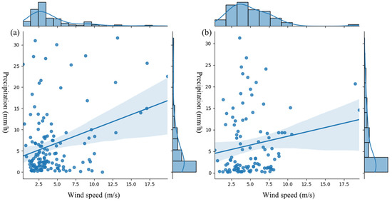Bivariate distribution of wind speed and precipitation in grid point for TC Class 1 (a) and Class 2 (b). The blue line is the linear regression fit, and the shading along the lines is the confidence interval (95%).