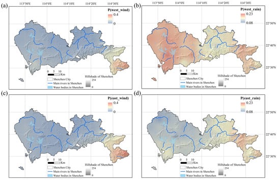 Figure 7a,c demonstrate that the spatial distributions of P(west_wind) and P(east_wind) have a similar pattern regardless of the TC landing location. The east is larger than the west, and the south is larger than the north because the water vapor and surface environment are distinct between the sea and the land, and TCs cause much stronger winds in coastal areas compared to inland areas. In Shenzhen, the TC-induced winds in the west have been significantly weakened due to the blockage of the Pearl River estuary and Hong Kong. The eastern region, particularly Dapeng District, lacks natural barriers and is frequently exposed to severe winds.