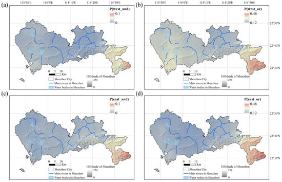 Spatial distribution of the probability of coupled hazards for road traffic. (a) P(west_and); (b) P(west_or); (c) P(east_and); (d) P(east_or).