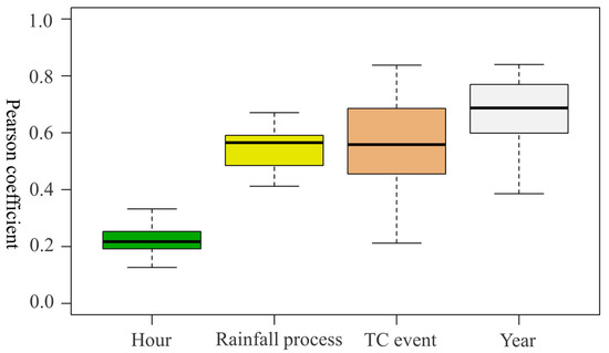 The trend in hazard assessment is toward high resolutions for refined risk analysis and emergency management. Figure 5 shows the weak correlation between the hourly wind speed and precipitation during the impact of TCs—this is surprising, but it also makes sense. A typhoon may bring rainfall for several hours, but it is not always windy. At a high temporal resolution, such as one hour, the TC-induced wind and precipitation are not synchronous. In previous studies, a higher correlation has been found by using maximum or cumulative values based on TC events or annual statistics. This finding suggests that we need to consider the time scale differences of TC hazard assessment. Here, we compared the Pearson correlation coefficients of wind and rain over various time scales. Coefficients were used instead of Copulas because Copula fitting results may vary for different time scales. The Pearson correlation coefficient represents the degree of linear correlation between winds and rains. A larger correlation indicates a larger risk of strong winds and heavy rains. Based on the filtered hourly data reaching three thresholds in Section 4.2, we calculated the maximum wind speed and cumulative precipitation for 39 grid points at four time scales, including the hour, rainfall process, TC event, and year. Here, a rainfall process is a set of continuous records with hourly precipitation data greater than 0. We then obtained their Pearson coefficients.
