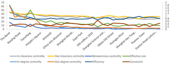 After the opening of Disneyland, the index values of Disneyland are in the forefront (Figure 3). The low degree of constraint reflects its relative independence in the overall network, indicating that Disneyland has already played an important role in the spatial network of tourism flows in Shanghai and has become one of the core tourism resources in Shanghai. However, its outward centrality index is slightly higher than that of inward centrality, reflecting that its function as a tourist distribution centre needs to be improved. The four index values of the Bund still rank first, the efficiency value increases, and the constraint value is reduced, reflecting that its core position in the spatial network of domestic tourism flows in Shanghai is strengthened. The index values of the Oriental Pearl TV Tower, Tianzifang, Chenghuang Temple, Yu Garden, and other nodes are still in the forefront and have increased slightly, indicating that the Disneyland project has further strengthened the interconnection of core tourism nodes in Shanghai. The index values of the Shanghai Science and Technology Museum, the Shanghai Wildlife Park, and other nodes have dropped significantly, although they are on the east bank of the Huangpu River with Disneyland, but the connection and integration effect of the line with Disneyland has not been realized as expected, which reflects the relatively independent status of Disneyland.
