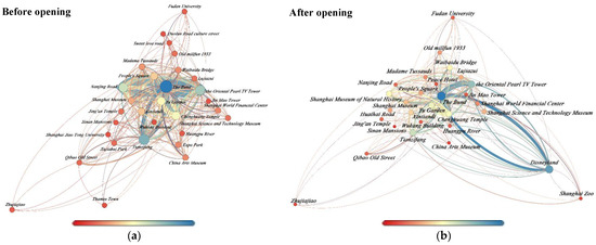 Using the degree (d) filtering function of Gephi 0.9.2 software for analysis (Table 3), the results show that the Bund is in the core of the network before and after the opening of Disneyland. After its opening, Disneyland became the core of the second layer of the network after the Bund. Compared with before the opening of Disneyland, the core of the third layer of the network after the opening of Disneyland has changed significantly, and only People’s Square, the Shanghai Museum, Xintiandi, Madame Tussauds, Waibaidu Bridge, the Shanghai World Financial Center, and Lujiazui have not changed. The China Art Museum has become the core of the fourth layer of the network, while the Shanghai Science and Technology Museum, the Wukang Building, 1933 Old Millfun, Jing’an Temple, the Shanghai Museum of Natural History, the Sinan Mansions, Qibao Old Street, and Zhujiajiao have become the core of the third layer of the network.