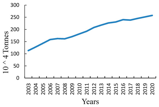 Variations in shrimp aquaculture production from 2003 to 2020. Data source: China Fishery Statistical Yearbooks. Available online: https://www.cafs.ac.cn/info/1397/37342.htm (accessed on 12 March 2022).