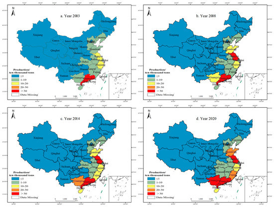 Spatial distribution of shrimp aquaculture production by province across different years. The subfigures (a–d) represents the spatial distribution of shrimp production in provinces of China in 2003, 2008, 2014 and 2020. Data source: China Fishery Statistical Yearbooks. Available online: https://www.cafs.ac.cn/info/1397/37342.htm (accessed on 12 March 2022).
