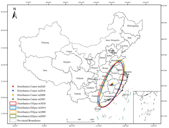 Distribution ellipses of shrimp aquaculture production across different years. Data source: China Fishery Statistical Yearbooks. Available online: https://www.cafs.ac.cn/info/1397/37342.htm (accessed on 12 March 2022).