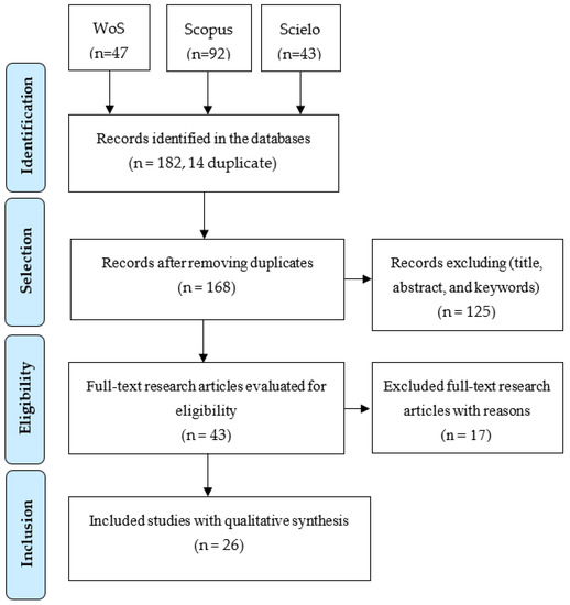 All searched documents were condensed and organized using Microsoft Excel 365. The data extraction from the Web of Science (WoS) and Scielo databases was carried out through Win tabulator, which downloads data in a text file (savedrecs.txt), while Scopus files were downloaded as a .csv format (comma-separated values). The selection of the primary studies was based on the PRISMA flowchart [22], presented in Figure 2, which shows four phases: the identification, selection, eligibility, and inclusion.