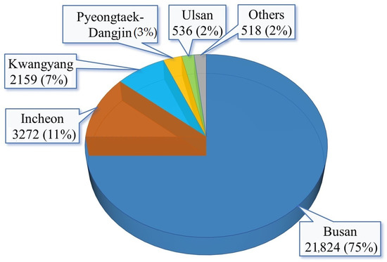 The shares in container throughput by Korean ports in 2020. Unit: TEU, %. Source: authors’ compilation adapted from 2020 container statistics of Busan port.