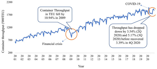 Container throughput of Busan port by month, January 2001 to December 2020. Source: authors’ compilation adapted from 2020 container statistics of Busan Port.